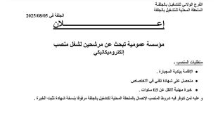 وزارة العمل والتشغيل والضمان الاجتماعي الوكالة الوطنية للتشغيل الفرع الولائي للتشغيل بالجلفة الملحقة المحلية للتشغيل بالجلفة ads إعــــــــــلان مؤسسة عمومية تبحث عن مرشحين لشغل منصب إلكتروميكانيكي الجلفة في 2025/08/05 متطلبات المنصب : الإقامة ببلدية المجبّارة. متحصل على شهادة تقني في الاختصاص. خبرة مهنية لاتقل …