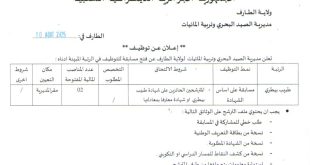 ولاية الطارف مديرية الصيد البحري وتربية المائيات ads الطارف في: 10 أوت 2025 إعلان عن توظيف تعلن مديرية الصيد البحري وتربية المائيات لولاية الطارف عن فتح مسابقة للتوظيف في الرتبة المبينة أدناه: الرتبةنمط التوظيفشروط الالتحاقعدد المناصب المفتوحةمكان التعيينأخرىمجيب بمركزيمسابقة على أساس الشهادةالمترشحون الحائزين على …