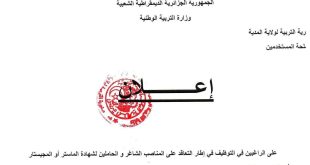وزارة التربية الوطنية مديرية التربية لولاية المدية مصلحة المستخدمين ads إعـــــــــــــــلان على الراغبين في التوظيف في إطار التعاقد على مناصب شاغرة ( من داخل أو خارج الولاية ) في الأطوار الثلاثة: ثانوي – متوسط – ابتدائي والحاملين لشهادة الماستر أو الليسانس في إحدى التخصصات …
