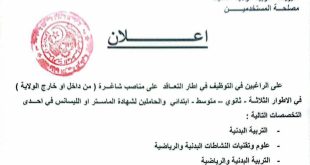 وزارة التربية الوطنية مديرية التربية لولاية سعيدة ads سعيدة في: 13.10.2025 إعلان تعلن مديرية التربية لولاية سعيدة لخرجي الجامعات عبر التراب الوطني الراغبين في التوظيف بصفة التعاقد لدى مصلحة المستخدمين في التخصصات الآتية: الرقمالرتبالمادةالتخصصعدد المناصب01أستاذ تعليم إبتدائي قسم أولالتربية البدنية والرياضة– شهادة الماستر – …