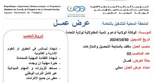 اعلانات توظيف الولايات المعنية: الجزائر العاصمة، بومرداس، البليدة، سطيف، برج بوعريرج، تيزي وزو، تلمسان، بسكرة، قسنطينة، بجاية، الوادي، غليزان، البيض، قالمة، النعامة، تيارت، عين تيموشنت، معسكر، الاغواط، باتنة وادرار يرجى من المهتمين التقرب من الادارة المعنية بالعرض او الملحقة المحلية للتشغيل حسب طبيعة الاعلان …