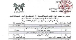 اعلان ads مستخرج من محضر إعلان النتائج النهائية لمسابقة و/أو التوظيف على أساس الشهادة للإلتحاق برتبة أستاذ مساعد قسم “ب” بعنوان السنة المالية 2024 الجامعة: مركز الجامعي ايليزي الشعبة: حقوق قانون عام عدد المناصب: 01 قائمة الناجحين نهائيا حسب درجة الاستحقاق: توظيف في الشركة …