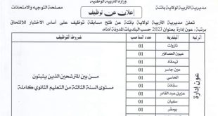 وزارة المالية المديرية الجهوية للأملاك الوطنية بسطيف المديرية الجهوية للأملاك الوطنية ads إعلان عن توظيف تعلن المديرية الجهوية للأملاك الوطنية بسطيف عن فتح مسابقات على أساس الشهادات والاختبارات للالتحاق بالرتب المبينة أدناه: إعلان عن مسابقات توظيف بمديرية التربية أعوان إدارة وأعوان حفظ البيانات الجزائرية …