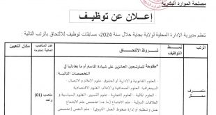 الجمهورية الجزائرية الديمقراطية الشعبية وزارة الإدارة المحلية ولاية بجاية مديرية الإدارة المحلية مصلحة الموارد البشرية ads إعلان عن توظيف تعلم مديرية الإدارة المحلية بولاية بجاية عن فتح باب التوظيف لسنة 2024، وذلك لشغل المناصب التالية: إعلان عن مسابقة توظيف بالمركز الوطني للبحث المطبق في …