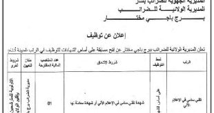 وزارة المالية المديرية العامة للضرائب المديرية الجهوية للضرائب ببشار المديرية الولائية للضرائب ببرج باجي مختار ads إعلان عن توظيف تعلن المديرية الولائية للضرائب ببرج باجي مختار عن فتح مسابقة على أساس الشهادات للتوظيف في الرتب المبينة أدناه: الرتبنمط التوظيفشروط الالتحاقعدد المناصب المالية المفتوحةمكان التعيينشرط …