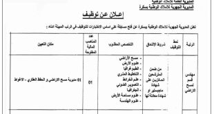 وزارة المالية المديرية العامة للأملاك الوطنية المديرية الجهوية للأملاك الوطنية ببسكرة ads تعلن المديرية الجهوية للأملاك الوطنية ببسكرة عن فتح مسابقة على أساس الاختبارات للتوظيف في الرتب المبينة أدناه: الرتبةنمط التوظيفشروط الالتحاقالتخصص المطلوبعدد المناصب المفتوحةمكان التعيينمهندس قسم لمسح الأراضيمسابقة على أساس الاختبارمن ضمن المترشحين …