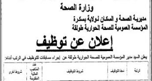 وزارة الصحة مديرية الصحة والسكان لولاية بسكرة المؤسسة العمومية للصحة الجوارية طولقة ads إعلان عن توظيف يعلن السيد مدير المؤسسة العمومية للصحة الجوارية طولقة عن إجراء مسابقات للتوظيف في الرتبتين التاليتين: إعلان عن مسابقة توظيف بالمركز الوطني للبحث المطبق في هندسة مقاومة الزلازل إعلان …