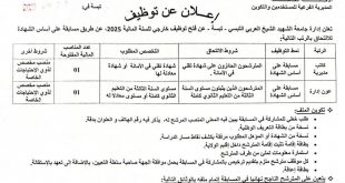 وزارة التعليم العالي والبحث العلميجامعة الشهيد الشيخ العربي التبسي – تبسةالمديرية الفرعية للمستخدمين والتكوين ads إعلان عن توظيف تعلن إدارة جامعة الشهيد الشيخ العربي التبسي – تبسة – عن فتح توظيف خارجي للسنة المالية 2025، عن طريق مسابقة على أساس الشهادة للملتحقين بالرتب التالية: …