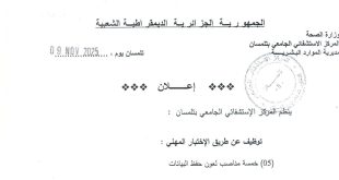 وزارة الصحة المركز الإستشفائي الجامعي بتلمسان مديرية الموارد البشرية ads إعــــــلان ينظم المركز الإستشفائي الجامعي بتلمسان: توظيف عن طريق الإختبار المهني : (05) خمسة مناصب لعون حفظ البيانات يجب أن يحتوي ملف الترشح على الوثائق التالية: طلب خطي نسخة طبق الأصل مصادق عليها من …