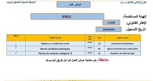 عرض عمل ads الهيئة المستخدمة: (CRCC) الإطار القانوني: P-ETR تاريخ التسجيل: 2024/05/04 مكان العمل: تندوف الوظائف المتاحة: سائق جرافة: 10 مناصب عامل نظافة: 4 مناصب سائق مركبة خفيفة: 2 منصب الشروط المطلوبة: سائق جرافة: شهادة أو دبلوم في قيادة الجرافات عامل نظافة: لياقة بدنية …