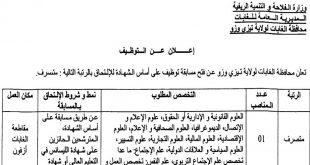 الجمهورية الجزائرية الديمقراطية الشعبية وزارة الفلاحة والتنمية الريفي ة المديرية العامة للغابات محافظة الغابات لولاية تيزي وزو ads إعلان عن توظيف تعلن محافظة الغابات لولاية تيزي وزو عن فتح مسابقة توظيف على أساس الشهادة للإلتحاق بالرتبة التالية: متسرف. مديرية التربية تفتح مسابقة توظيف العمال …