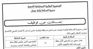 مديرية الصناعة لولاية جيجل ads إعلان عن توظيف تعلن مديرية الصناعة لولاية جيجل عن فتح مسابقة توظيف على أساس الاختبار المهني للالتحاق بمنصب الشغل المبين أدناه: منصب الشغل: عامل مهني من المستوى الأول بعقد غير محدد المدة بالتوثيت الكامل عدد المناصب: 01 شروط المشاركة: …