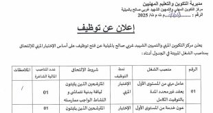 مديرية التكوين والتعليم المهنيين مركز التكوين المهني والتمهين الشهيد غربي صالح بالمدية ads إعلان عن توظيف يعلن مركز التكوين المهني والتمهين الشهيد غربي صالح بالمدية عن فتح توظيف على أساس الاختبار المهني للإلتحاق بمناصب الشغل المبينة في الجدول أدناه: الرقممنصب الشغلنمط التوظيفشروط الإلتحاقعدد المناصب …