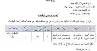 وزارة الصحة مديرية الصحة والسكان لولاية جيجل المؤسسة العمومية للصحة الجوارية – سيدي معروف ads إعلان عن توظيف تعلن إدارة المؤسسة العمومية للصحة الجوارية- سيدي معروف – عن فتح مسابقة للتوظيف على أساس الشهادة في الرتب المبينة أدناه: الرتبةنمط التوظيفشروط الالتحاقالمطلوبالمكانالتخصصشروط أخرىمساعد التمريض للصحة …
