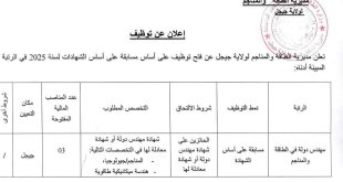 وزارة الطاقة والمناجم والطاقات المتجددة مديرية الطاقة والمناجم لولاية جيجل مديرية الطاقة والمناجم لولاية بومرداس ads إعلان عن توظيف تعلن مديرية الطاقة والمناجم عن فتح توظيف على أساس مسابقة على أساس الشهادات لسنة 2025 في الرتبة المبينة أدناه: إعلان عن مسابقة توظيف بالمركز الوطني …