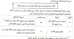أكمل القراءة »إعلان عن فتح مسابقة توظيف بعنوان 2025 بمديرية التربية لولاية عين تموشنت