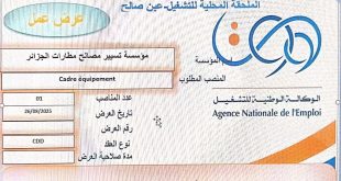 وزارة العمل و التشغيل و الضمان الإجتماعي الفرع الولائي للتشغيل-عين صالح الملحقة المحلية للتشغيل-عين صالح الوكالة الوطنية للتشغيل ads عرض عمل المؤسسة: مؤسسة تسيير مصالح مطارات الجزائر المنصب المطلوب: Cadre équipement عدد المناصب: 01 تاريخ العرض: 26/08/2025 نوع العقد: CDD شهادة ماستر أو مهندس …