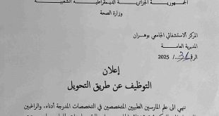 وزارة الصحة المركز الاستشفائي الجامعي بوهران المديرية العامة ads إعلان التوظيف عن طريق التحويل نهني إلى علم الممارسين الطبيين المتخصصين في التخصصات المدرجة أدناه، والراغبين بالتحويل إلى المركز الاستشفائي الجامعي وهران بالتقدم لإيداع طلباتهم على مستوى مديرية الموارد البشرية. بما في ذلك الممارسين الطبيين …