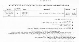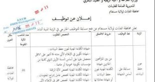 وزارة الفلاحة والتنمية الريفية والصيد البحري المديرية العامة للغابات محافظة الغابات لولاية مستغانم ads إعلان عن توظيف الرقمالرتبةنمط التوظيفشروط الإلتحاقالمهام المطلوبة01عون حفظ البياناتمسابقة على أساس الشهادةمن بين المترشحين الحائزين على شهادة الكفاءة المهنية لـ:شهادة الكفاءة المهنية لـ: عون حفظ البيانات أو شهادة معادلة لها. …