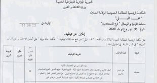 وزارة الثقافة والفنون المكتبة الرئيسية للمطالعة العمومية لولاية تيارت “محمد الميلي” مصلحة الإدارة والوسائل – فرع المستخدمين ads تيارت في: 21 جانفي 2026 إعـلان عن توظيف تعلن المكتبة الرئيسية للمطالعة العمومية لولاية تيارت “المجاهد محمد الميلي” عن فتح مسابقات توظيف بمكتبة “جاك بيرك” بفرندة …