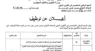أكمل القراءة »اعلان عن توظيف بالمعهد الوطني المتخصص في التكوين المهني اساتذة متخصصين واداريين