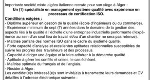 اعلان توظيف ads تعلن شركة مختلطة (جزائرية – إيطالية) كبرى عن توظيف لمقرها الكائن بالجزائر العاصمة: أخصائي واحد (1) في إدارة نظام الجودة، مع خبرة في عمليات الحصول على شهادات الأيزو (ISO). الشروط المطلوبة: شهادة عليا في إدارة الجودة (مدرسة مهندسين أو مدرسة تجارة). …