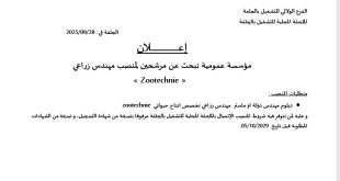 وزارة العمل والتشغيل والضمان الاجتماعي الوكالة الوطنية للتشغيل الفرع الولائي للتشغيل بالجلفة الملحقة المحلية للتشغيل بالجلفة ads إعلان مؤسسة عمومية تبحث عن مرشحين لمنصب مهندس زراعي « Zootechnie » متطلبات المنصب: دبلوم مهندس دولة أو ماستر مهندس زراعي تخصص إنتاج حيواني zootechnie وعليه لمن …