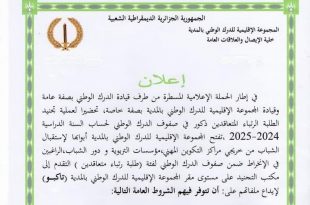 الجمهورية الجزائرية الديمقراطية الشعبيةالقيادة الإقليمية للدرك الوطني المديةخلية الإيصال والعلاقات العامة ads إعلان في إطار الحملة الإعلامية المسطرة من طرف قيادة الدرك الوطني بصفة عامة وقيادة المجموعة الإقليمية للدرك الوطني بالمدية بصفة خاصة، قصد عملية تجنيد الطلبة الراغبين في الانخراط في صفوف الدرك الوطني …