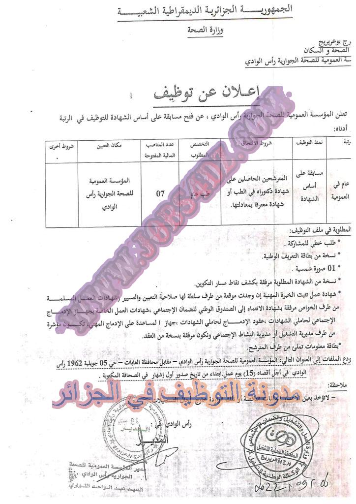 تعلن المؤسسة العمومية للصحة الجوارية راس الوادي عن فتح توظيف مباشر على اساس الشهادة في الرتب المبينة ادناه