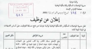 وزارة التربية الوطنية مديرية التربية لولاية الجلفة مصلحة المستخدمين والامتحانات ads الجلفة في: 23/11/2025 إعلان عن توظيف تعلن مديرية التربية لولاية الجلفة عن فتح مسابقة توظيف للالتحاق بمناصب الشغل المبينة في الصور أدناه حسب البلديات في الملحق المرفق: مطار الجزائر يفتح باب التوظيف: إعلان …