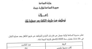 وزارة الصناعة مديرية الصناعة لولاية جيجل ads إعـــلان توظيف عن طريق التكفل بعد عملية نقل تعلن مديرية الصناعة لولاية جيجل عن فتح باب الترشيح للتوظيف عن طريق التكفل بعد عملية النقل في حالة نشاط بعنوان سنة 2025 للالتحاق بالرتبة المبينة أدناه: الرتبةعدد المناصبكاتب مديرية …