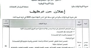 أكمل القراءة »إعلان عن توظيف بمديرية التربية لولاية بسكرة