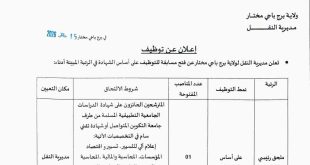وزارة الداخلية والجماعات المحلية والتهيئة العمرانية مديرية النقل ولاية برج باجي مختار ads في برج باجي مختار في: 15 جانفي 2026 إعلان عن توظيف تعلن مديرية النقل لولاية برج باجي مختار عن فتح مسابقة للتوظيف على أساس الشهادة في الرتبة المبينة أدناه: الرتبةنمط التوظيفعدد …