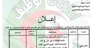 ولاية: بسكرة دائرة: بسكرة بلدية: بسكرة ads إعلان مديرية تسيير الموارد البشرية مصلحة تسيير المستخدمين يعلن السيد رئيس المجلس الشعبي البلدي – عن فتح مسابقة على أساس الاختبار المهني للالتحاق بالمناصب المبينة أدناه بعنوان سنة 2025. الرتبةنمط التوظيفشروط الالتحاقعدد المناصب المفتوحةمكان التعيينملحق رئيسي للإدارة …
