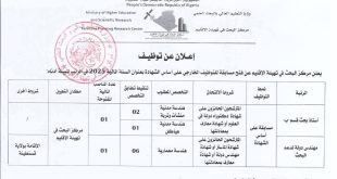 وزارة العمل والتشغيل والضمان الاجتماعي المفتشية العامة للعمل المفتشية الجهوية للعمل باتنة إعلان عن توظيف ads تعلن المفتشية الجهوية للعمل ناحية باتنة عن فتح توظيف في أم البواقي عن طريق الإختبار المهني في منصب شغل المبين أدناه: إعلان عن مسابقة توظيف بالمركز الوطني للبحث …