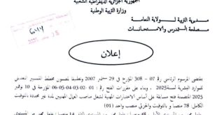 وزارة التربية الوطنية مديرية التربية لولاية النعامة مصلحة المستخدمين والامتحانات ads إعلان بمقتضى المرسوم الرئاسي رقم 07 – 308 المؤرخ في 29 سبتمبر 2007، والمتضمن كيفيات تسيير وتوظيف المستخدمين المكلفين بتسيير الموارد البشرية لسنة 2025، وبناء على مقررات الفتح رقم : 01 – 02 …