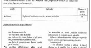 تعلن مديرية التجهيزات العمومية لولاية تيبازة عن فتح مسابقة للتوظيف في ارتب التالية ads مهندس معماري نمط التوظيف مسابقة على اساس الشهادة عدد المناصب 01 تاريخ نشر الاعلان : 18 جويلية 2021 اخر اجل لايداع الملفات 15 يوم من تاريخ الاعلان تفاصيل اكثر في …