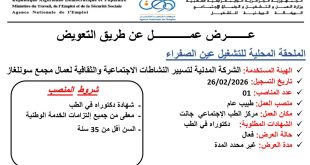 وزارة العمل والتشغيل والضمان الاجتماعي الوكالة الوطنية للتشغيل الملحقة المحلية للتشغيل عين الصفراء ads عرض عمل عن طريق التعويض الهيئة المستخدمة: الشركة المدنية لتسيير النشاطات الاجتماعية والثقافية لعمال مجمع سونلغاز تاريخ التسجيل: 26/02/2026 عدد المناصب: 01 منصب العمل: طبيب عام مكان العمل: مركز الطب …