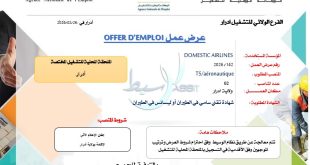 وزارة العمل والتشغيل والضمان الاجتماعي الوكالة الوطنية للتشغيل الفرع الولائي للتشغيل أدرار ads أدرار في: 26 / 02 / 2026 عرض عمل OFFER D’EMPLOI الملحقة المحلية للتشغيل المختصة أدرار المؤسسة المستخدمة :DOMESTIC AIRLINESالمنصب المطلوب :TS/aéronautiqueعدد المناصب :02مكان العمل :ولاية أدرارالشهادة المطلوبة :شهادة تقني سامي …