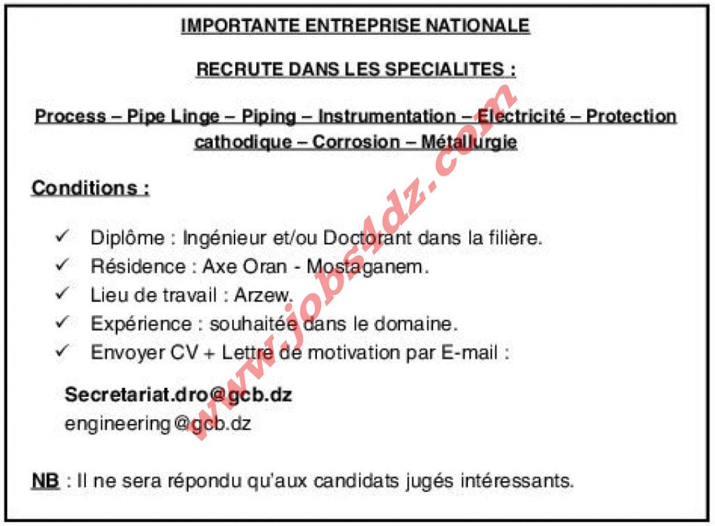 شركة وطنية هامة (شركة GCB فرع من شركة سوناطراك) توظف في الإختصاصات التالية :