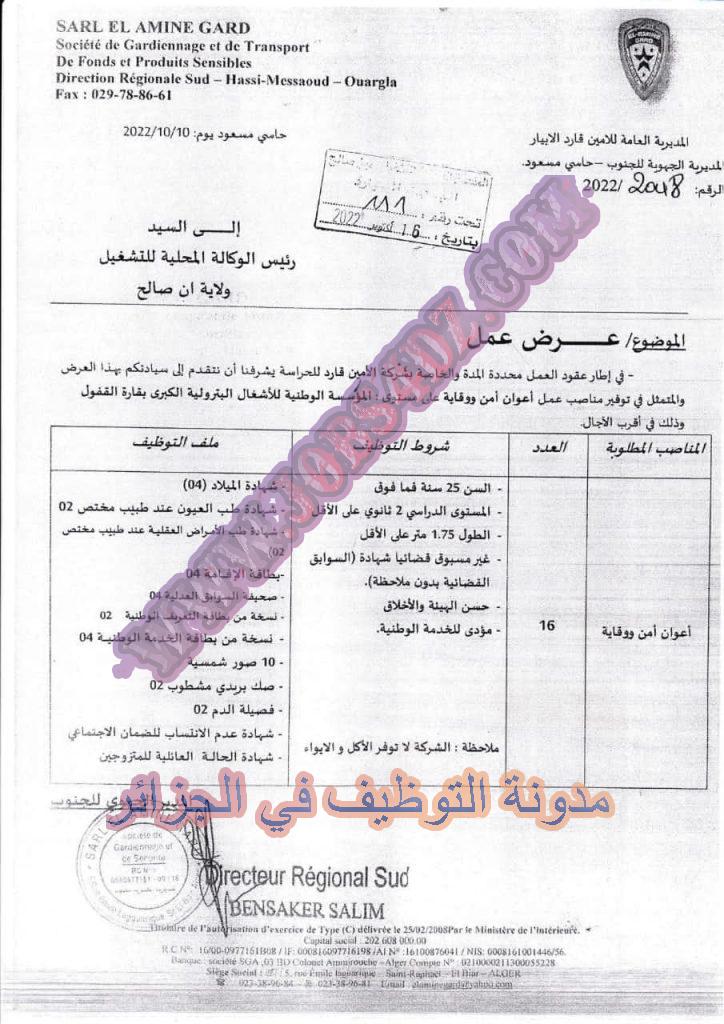 تعلن الملحقة المحلية للتشغيل عين صالح عن عرض عمل بمؤسسة امين قارد amine gard كما هو موضح ادناه
