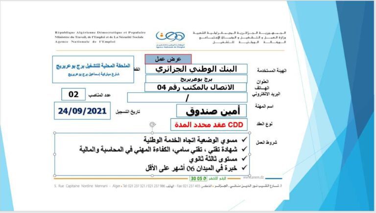 تعلن الملحقة المحلية للتشغيل برج بوعريريج عن عرض عمل بالبنك الوطني الجزائري BNA كما هو موضح ادناه