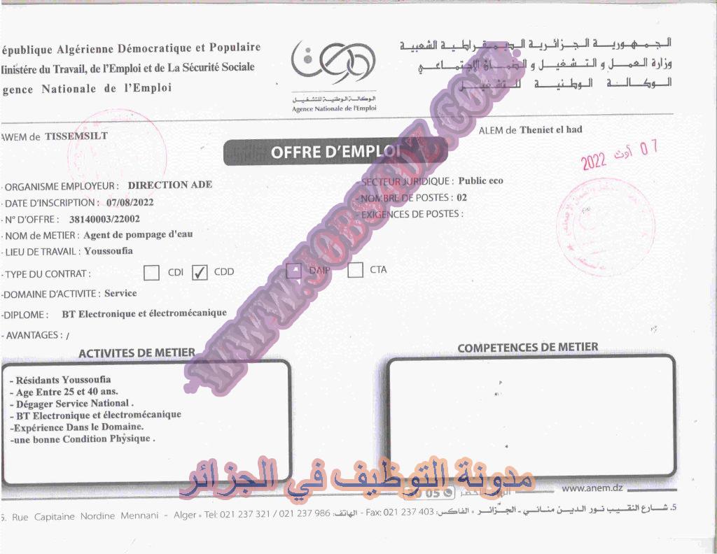 تعلن الملحقة المحلية للتشغيل ثنية الحد عن توفر عرض عمل بالجزائرية للمياه ADE كما هو موضح ادناه