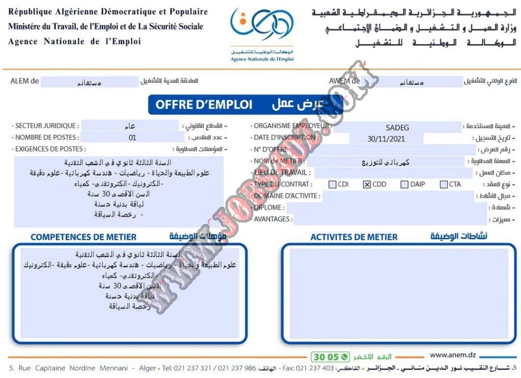 عرض عمل بالشركة الجزائرية لتوزيع الكهرباء و الغاز SADEG مستغانم