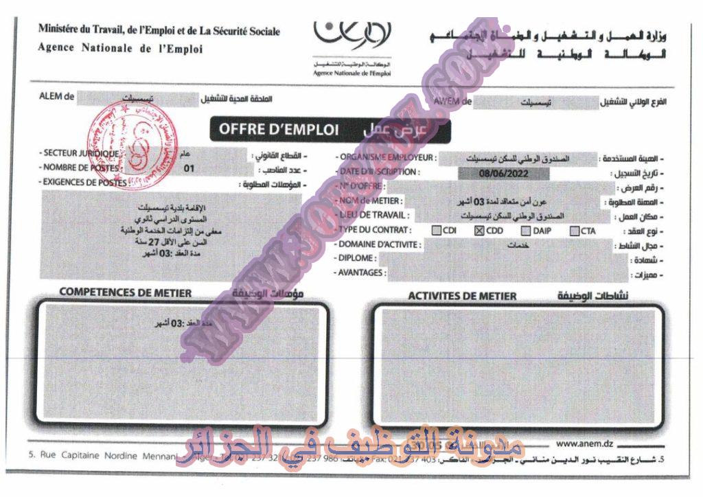 تعلن الملحقة المحلية للتشغيل تيسمسيلت عن توفر عرض عمل على مستوى الملحقة بالصندوق الوطني للسكن CNL تيسمسيلت كما هو موضح ادناه بالتفصيل