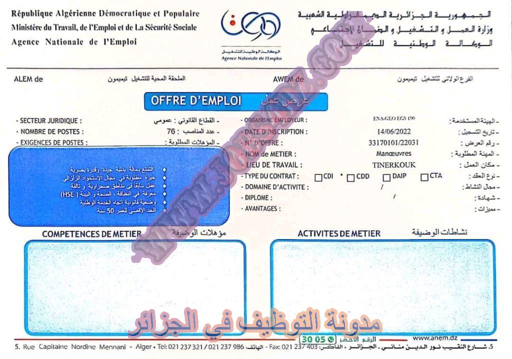 تعلن الملحقة المحلية للتشغيل تيميمون عن توفر عروض عمل بالمؤسسة الوطنية للجيوفيزياء ENAGEO EGS 190 في المناصب التالية