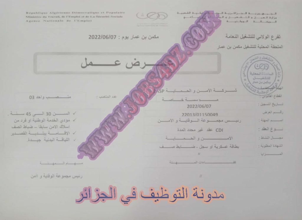 تعلن الملحقة المحلية للتشغيل مكمن بن عمار عن توفر عرض عمل بشركة الأمن و الحماية 2SP بالتفصيل الموضح ادناه
