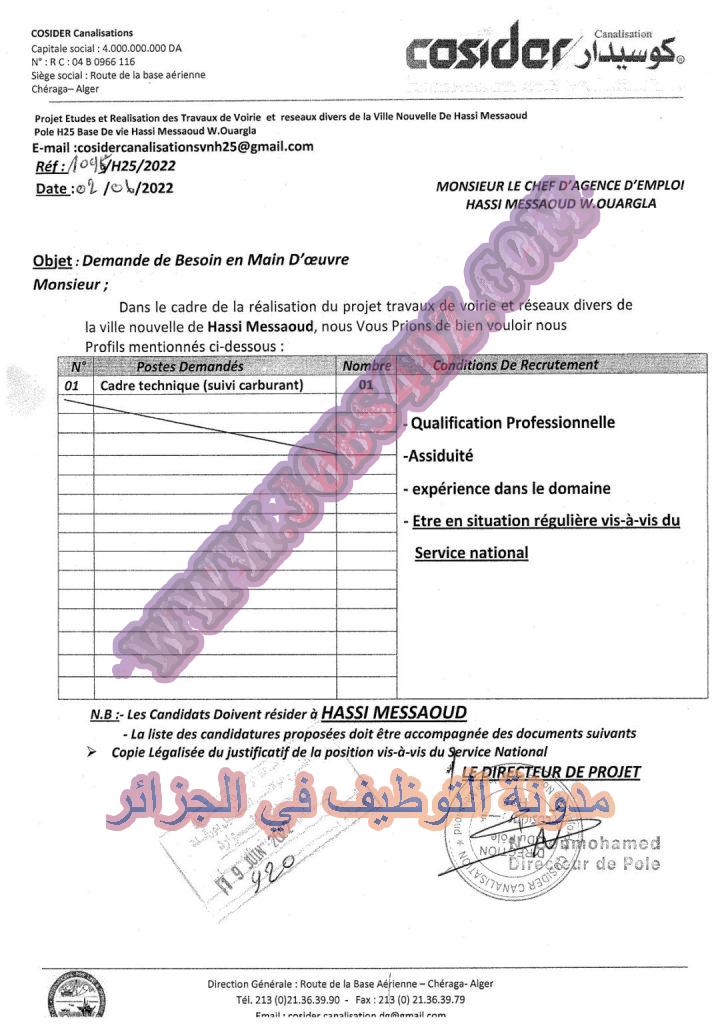 تعلن الملحقة المحلية للتشغيل حاسي مسعود عن توفر عرض عمل بشركة كوسيدار cosidar في المنصب التالي