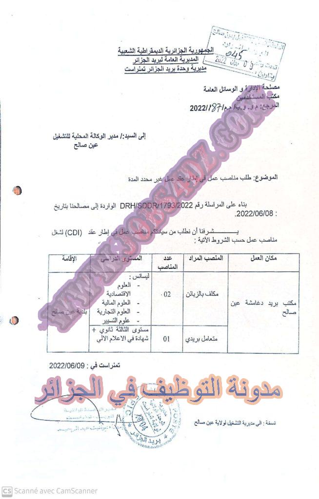 عرض عمل بمؤسسة ببريد الجزائر ان صالح على مستوى الوكالة المحلية للتشغل عين صالح في المناصب التالية
