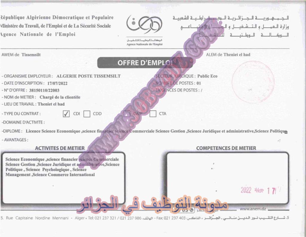 يتم نشر عروض العمل على الصفحة الرسمية للفرع الولائي للتشغيل#الاعلان يخص الملحقة المحلية للتشغيل تيسمسيلت